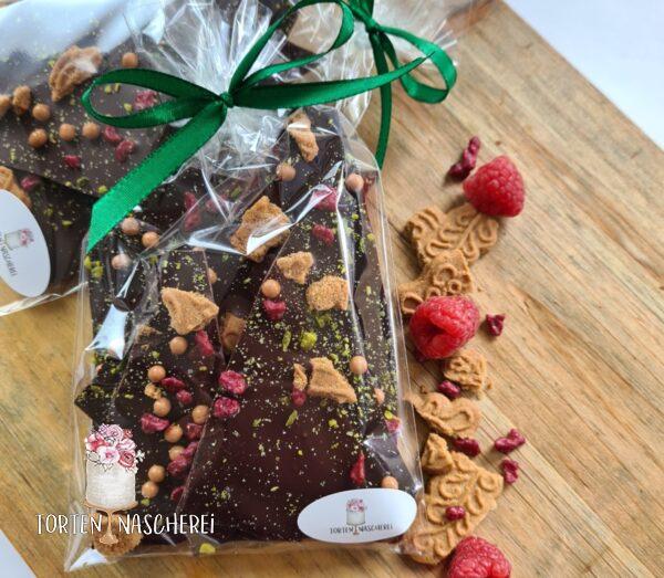 Zartbitter Schokolade mit Spekulatius, Pistazien & Himbeerstücken