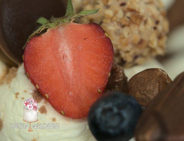 Kakao- Mürbteigboden mit hausgemachter Heidelbeermarmelade und luftiger Mascarpone-Topfen-Sahne gefüllt, mit gemischten Beeren, süßen Bonbons und frischer Minze verziert.